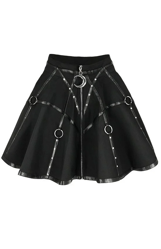 La jupe est agrémentée de sangles harnais en simili cuir et de nombreux rivets métalliques