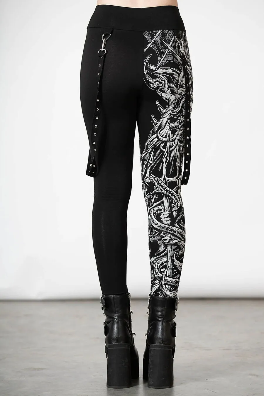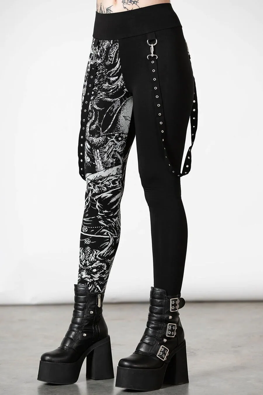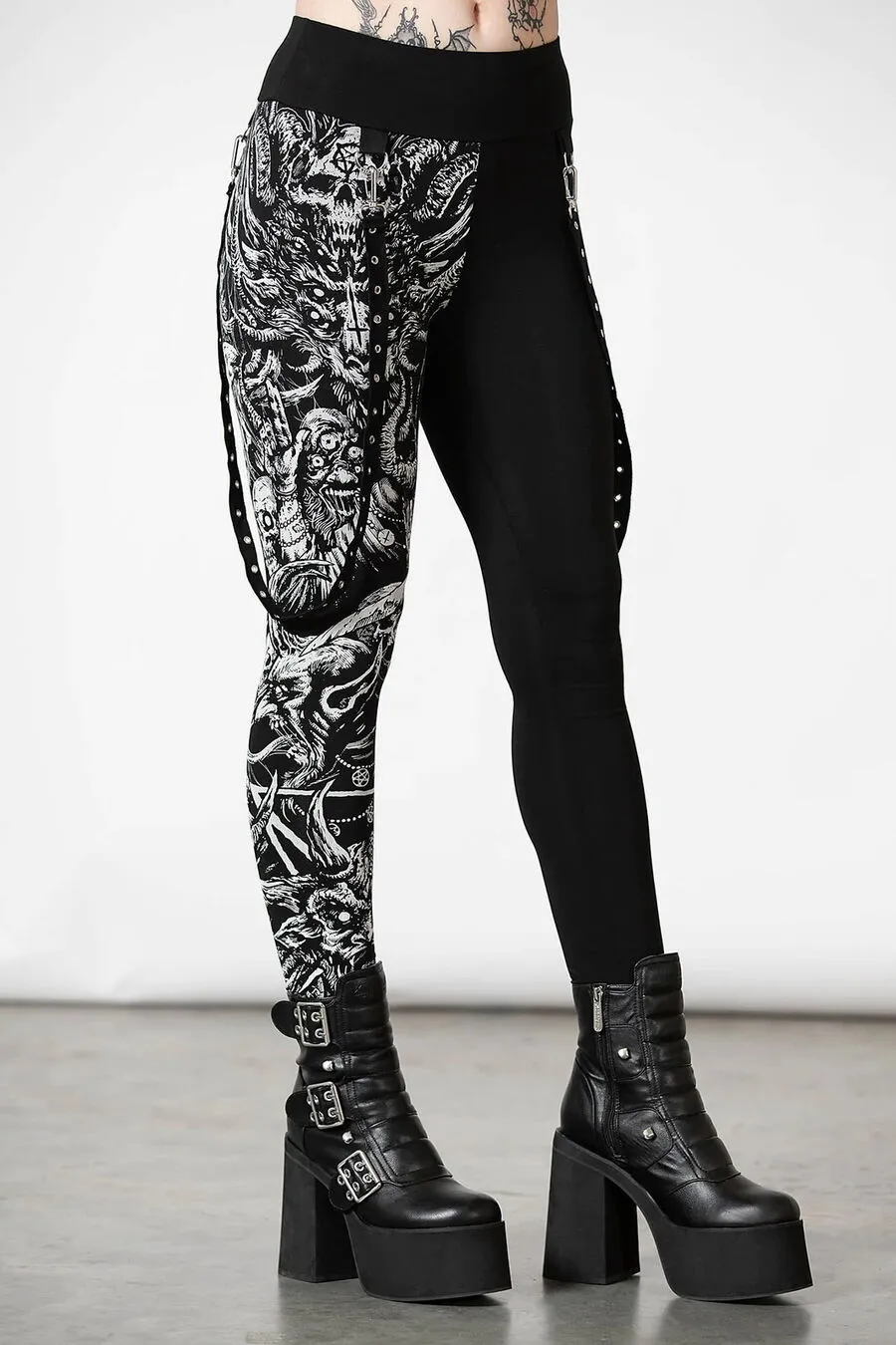Design graphique asymétrique sur la jambe droite représentant de terrifiants monstres