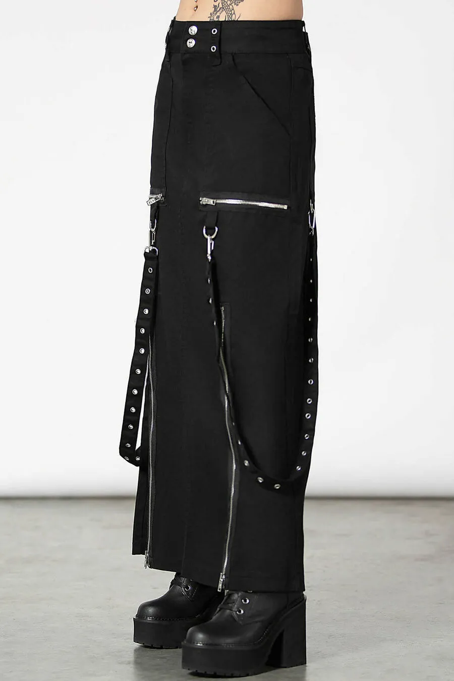 Longue jupe en tissu denim noir de belle qualité par Killstar