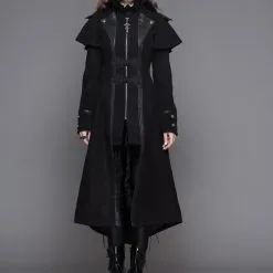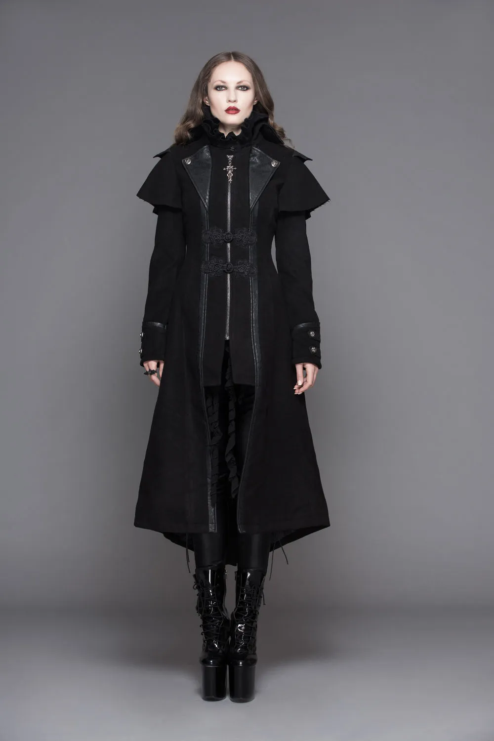Superbe manteau gothique en tissu polaire noir d’une qualitĂ© exceptionnelle, il est agrĂ©mentĂ© de 2 grandes broderies, revers de col en simili cuir incrustĂ© de motifs baroques, boutons de dĂ©coration en Ă©tain avec fleur de lys