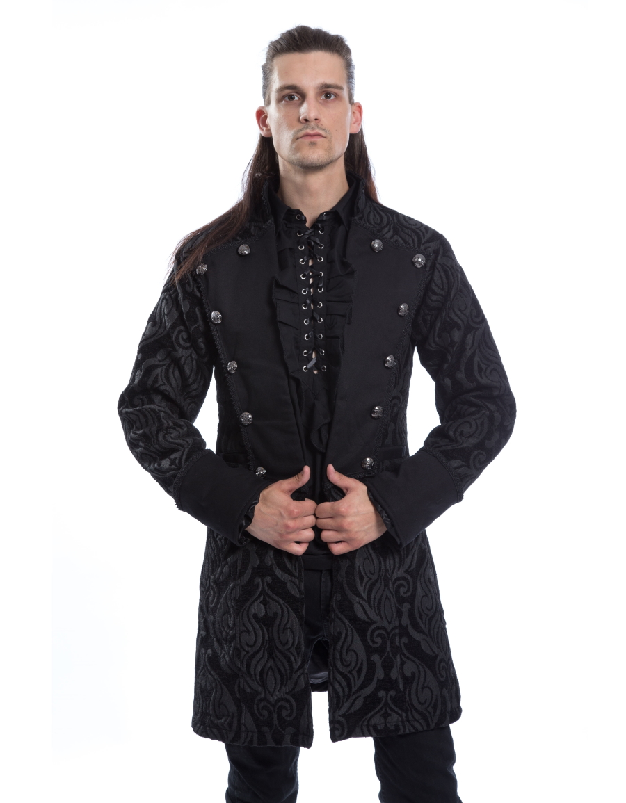 A mi-chemin entre veste et manteau le modĂšle ‘Monarch’ signĂ© Poizen Industries plaira Ă tous ceux qui aiment le style gothique victorien royaliste de grande classe
