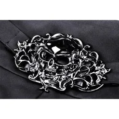La jupe est ornĂ©e d’une grosse boucle en mĂ©tal avec un Ă©norme skull tenant une rose dans sa bouche