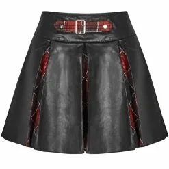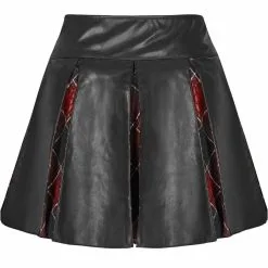 Belle jupe plissée en simili cuir noir et tissu tartan rouge