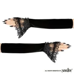 Longues mitaines en velours noir avec poignets en dentelle française.