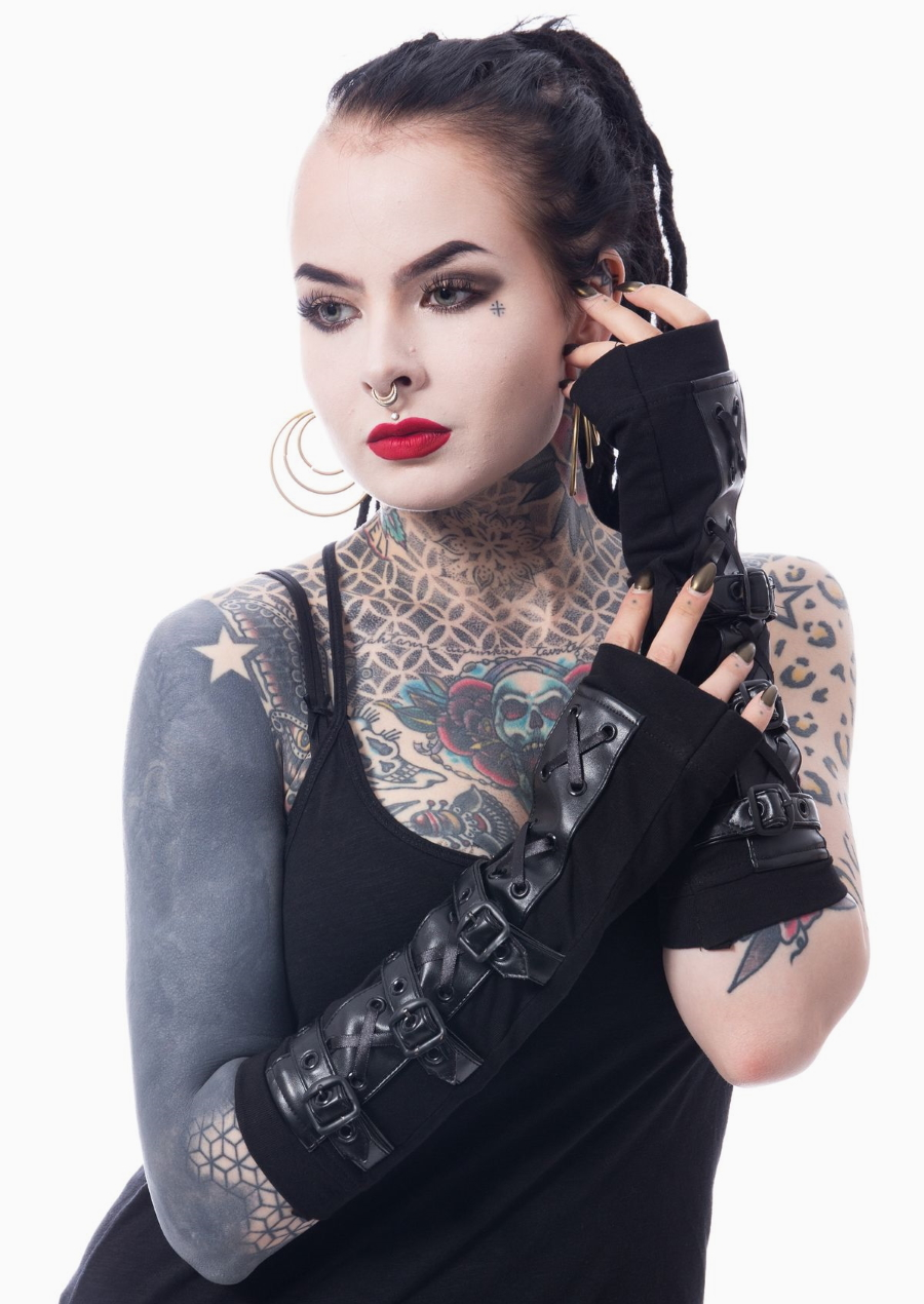 Depuis toujours les mitaines font partie intégrante du look goth, ce modÚle est dans la pure lignée dark avec sa touche total black