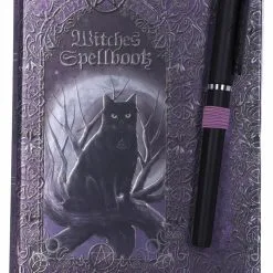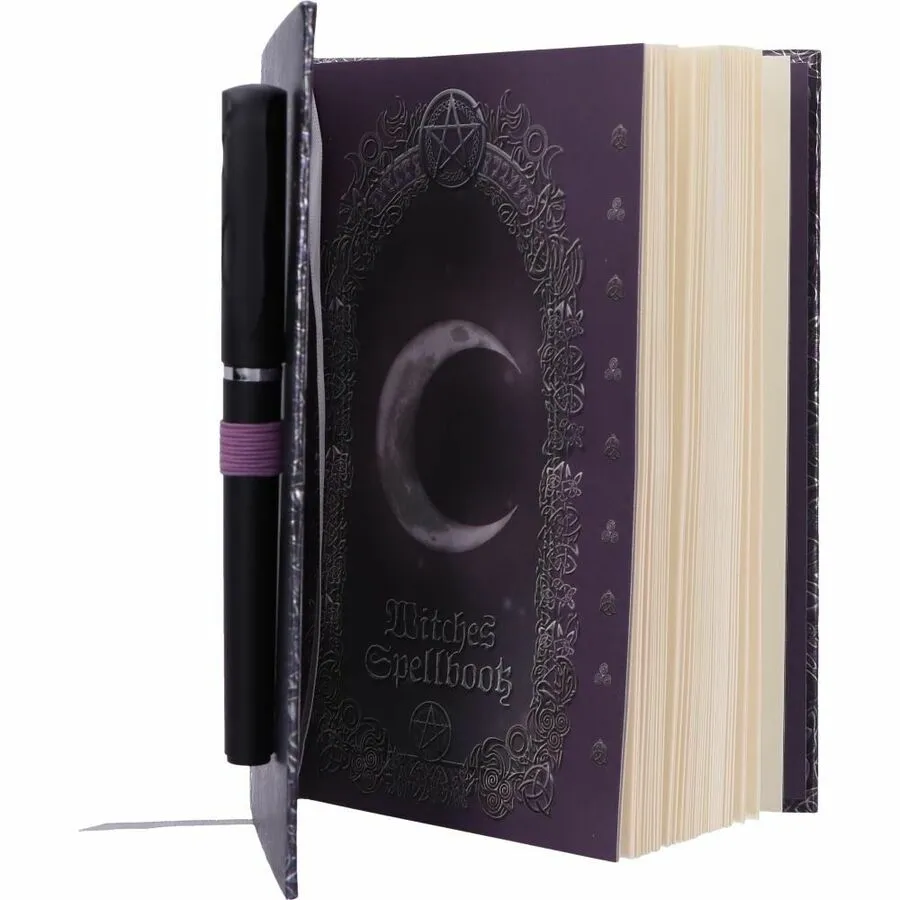 Le chat est encadré par une multitude de motifs celtiques élégants qui incluent le Triquetra, le Triskelion et 2 pentagrammes ornés. Il y a un espace plus simpliste le long du cÎté droit qui abrite un beau stylo qui reflÚte le design du livre