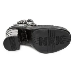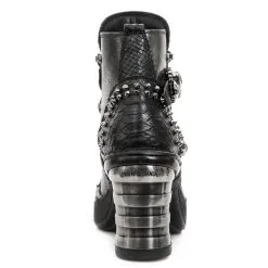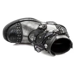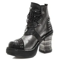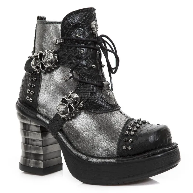 Superbes bottines New Rock Ă talons et cuir bi-matiĂšre. Un cuir lisse gris mĂ©tallisĂ©/chrome associĂ© Ă un cuir noir brillant Ă effet peau de serpent. Le tout est en plus agrĂ©mentĂ© de clous et de crĂąnes en mĂ©tal qui font office de boucles. On retrouve cette touche de mĂ©tal dans le talon, typique de la marque New Rock. Avec ces bottines, c’est un look hors normes assurĂ© !Â