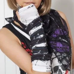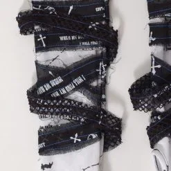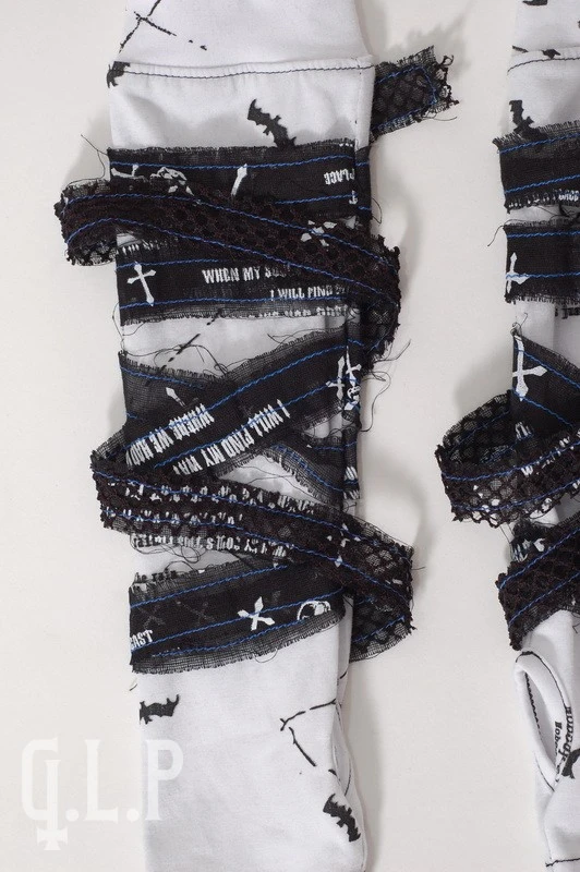 Longues mitaines gothiques en coton dĂ©corĂ©es d’Ă©pingles de nourrice et de piĂšces de tissu effet vieilli, passage pour le pouce.
