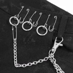 Il est agrĂ©mentĂ© d’Ă©pingles de nourrice et d’une triple chaĂźne amovible