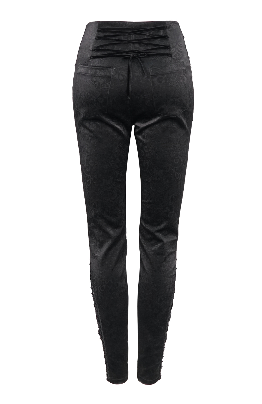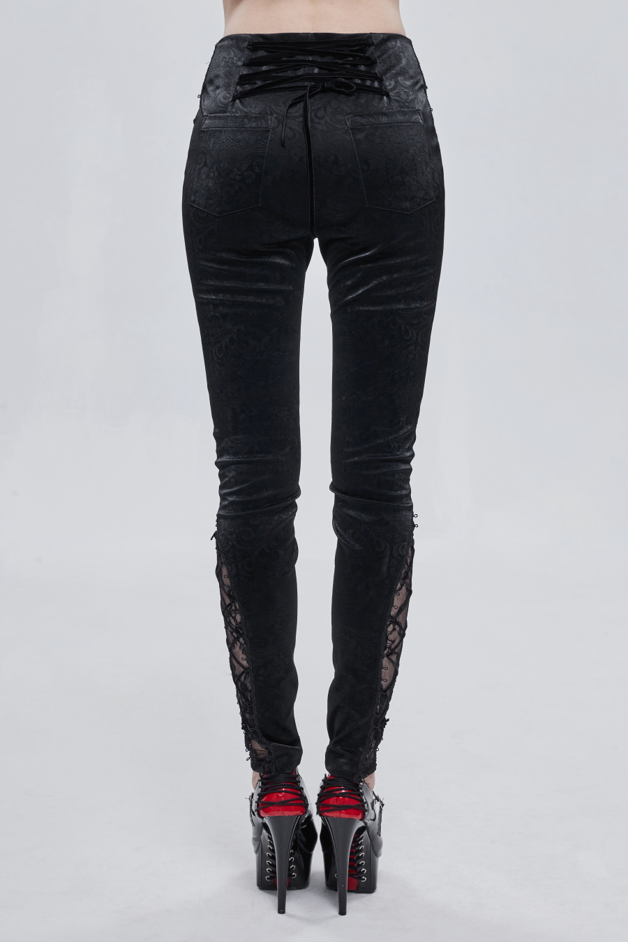Le bas des jambes est Ă©galement agrĂ©mentĂ© d’empiĂšcement laissant apparaĂźtre une dentelle noire cette fois avec lacets de velours et broderies