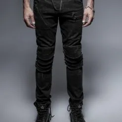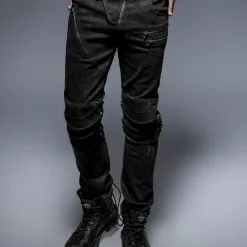 Pantalon rock pour homme en coton stretch noir effet tachĂ©, il est agrĂ©mentĂ© d’empiĂšcement aux genoux style armure de guerrier avec des gros rivets en dĂ©coration. Ces empiĂšcements lui procurent toute son originalitĂ© et en font un pantalon hors du commun