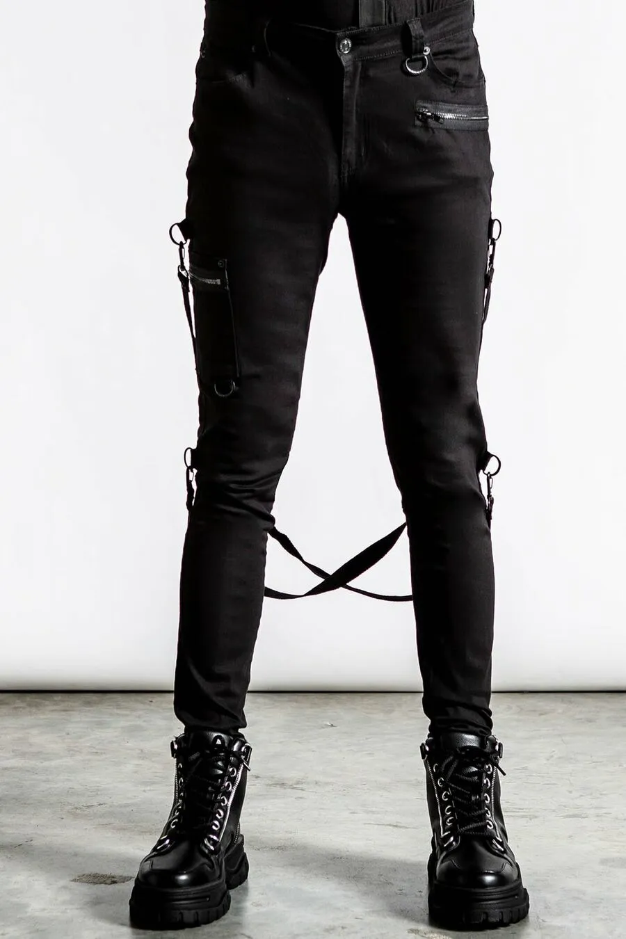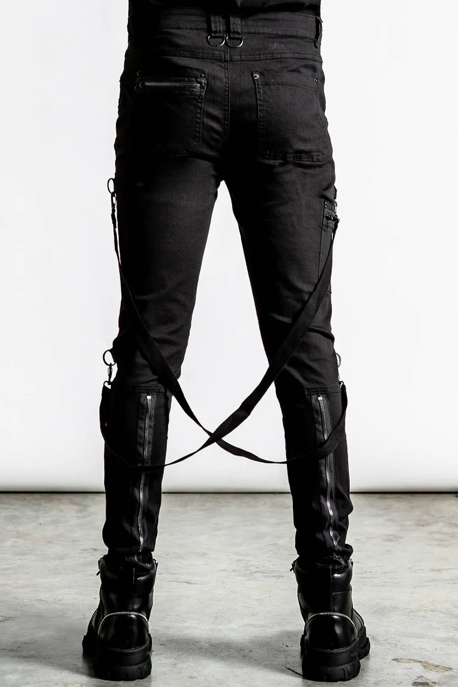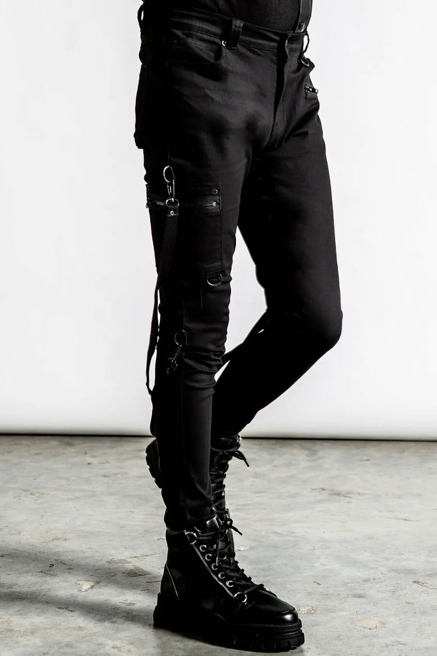 Toutes les piÚces métalliques sont noires (oeillets, zips, braguette, bouton, anneaux)