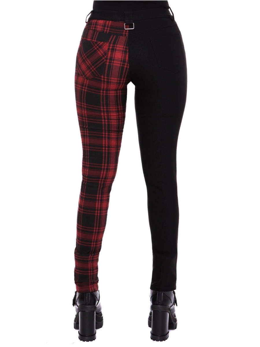 Jambe droite en tissu noir et jambe gauche en tissu tartan rouge