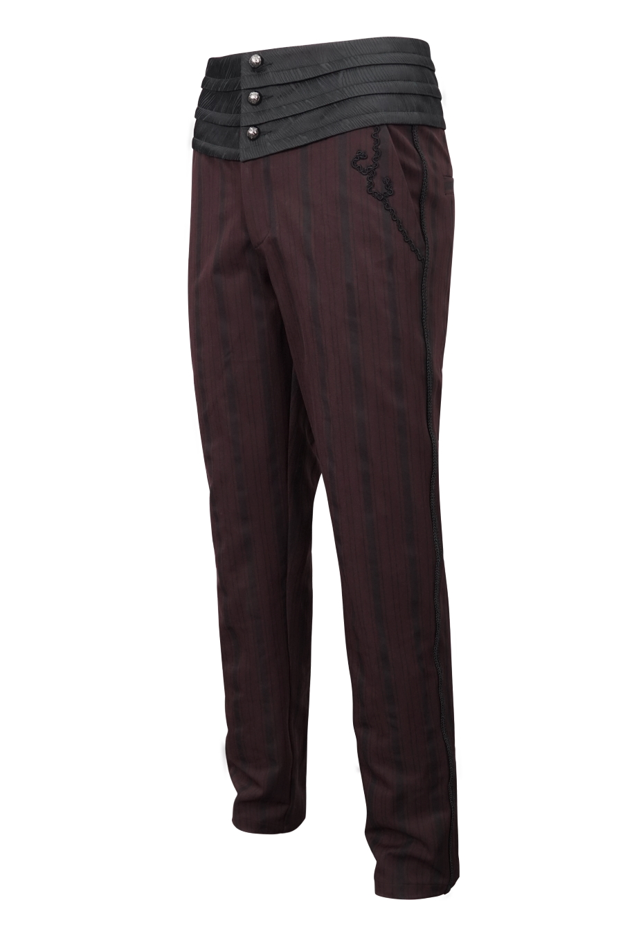 Ce pantalon signé Devil Fashion est fabriqué dans une toile pinstripe lie de vin