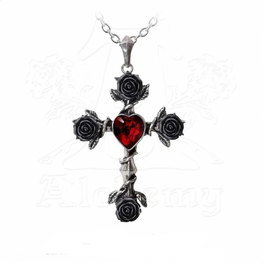 TrĂšs belle croix gothique ornĂ©e de roses noires aux extrĂ©mitĂ©s et d’un coeur rouge en cristal Swarovski en son centre