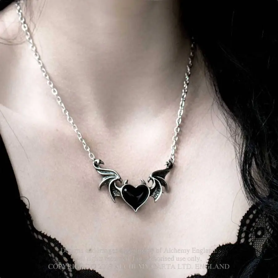 Son coeur noir Ă©maillĂ© est bordĂ© d’ailes de dĂ©mon