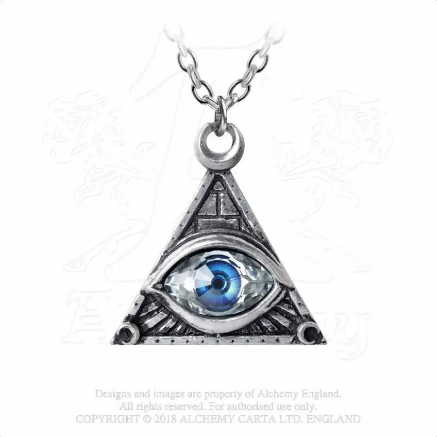 Ce pendentif en Ă©tain vieilli en forme de pyramide sertie d’un superbe oeil bleu en cristal Swarovski