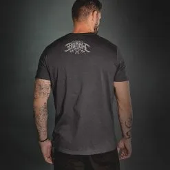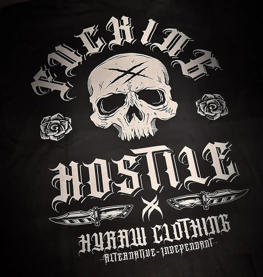 Grande sĂ©rigraphie au dos reprĂ©sentant un Ă©norme skull avec l’inscription ‘Fucking Hostile’
