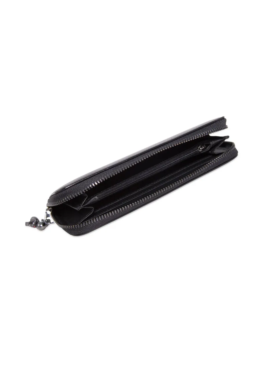 A l’intĂ©rieur il possĂšde un poche central Ă zip pour la monnaie et de chaque cĂŽtĂ© de nombreux rangements pour cartes, billets et papiers