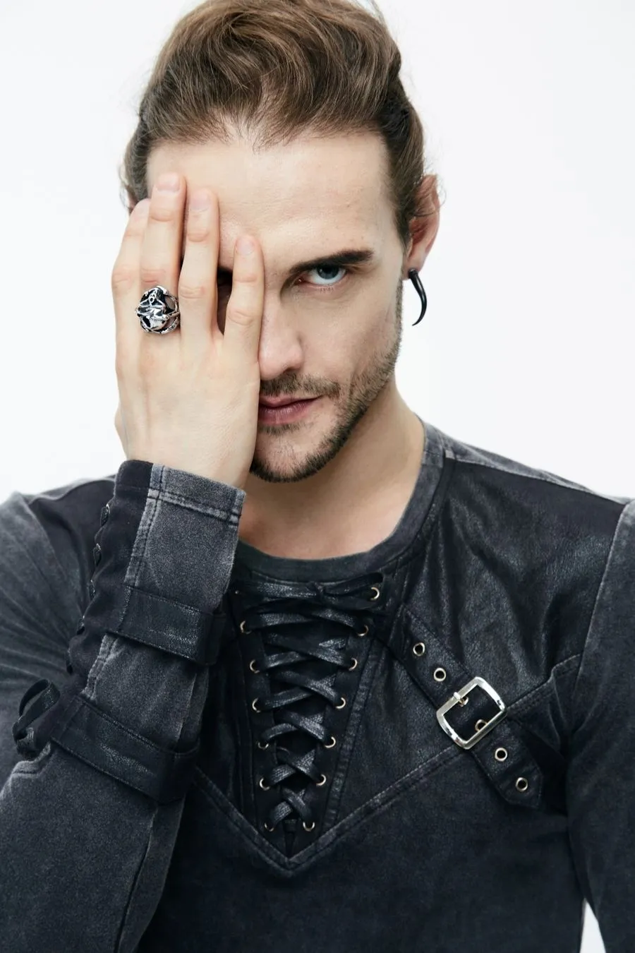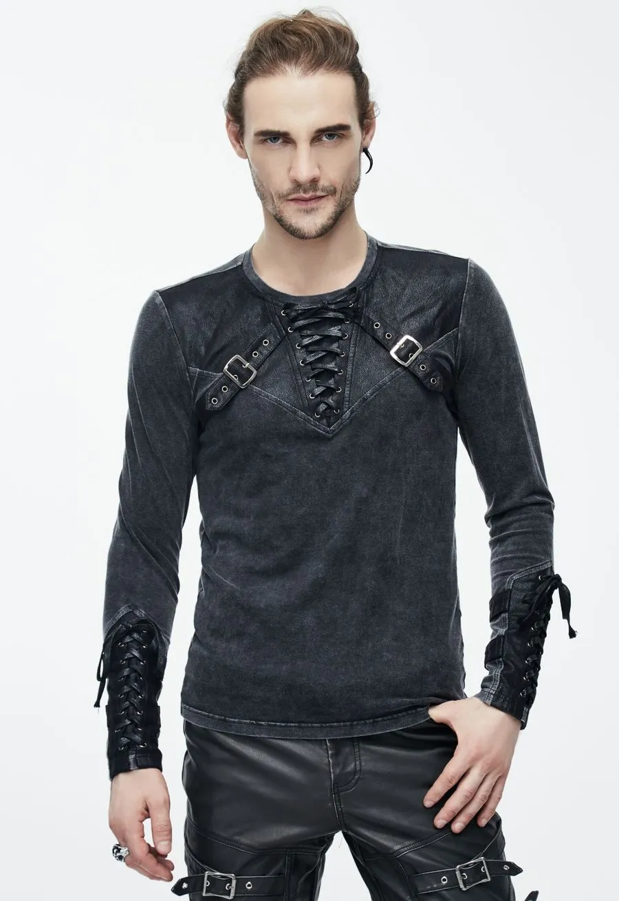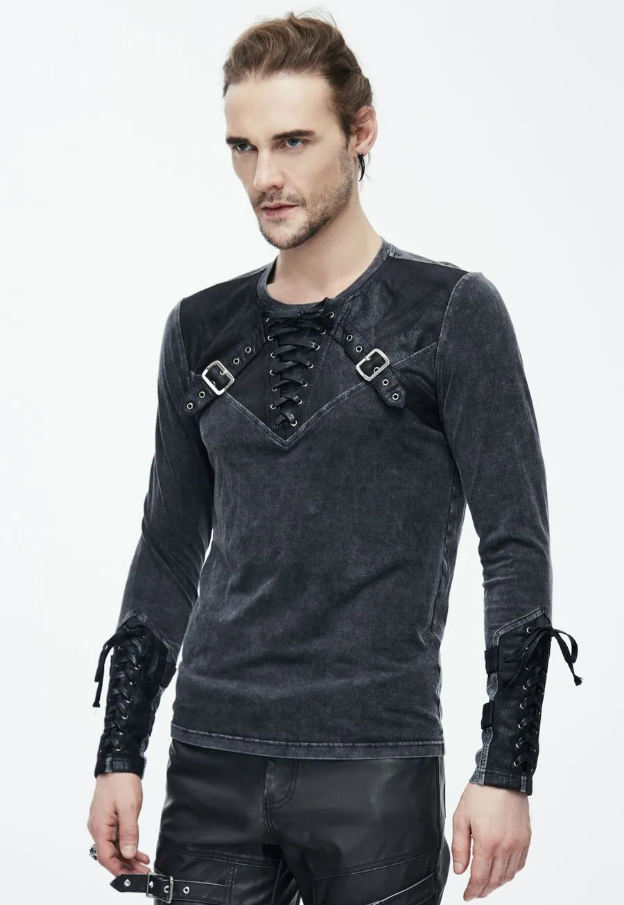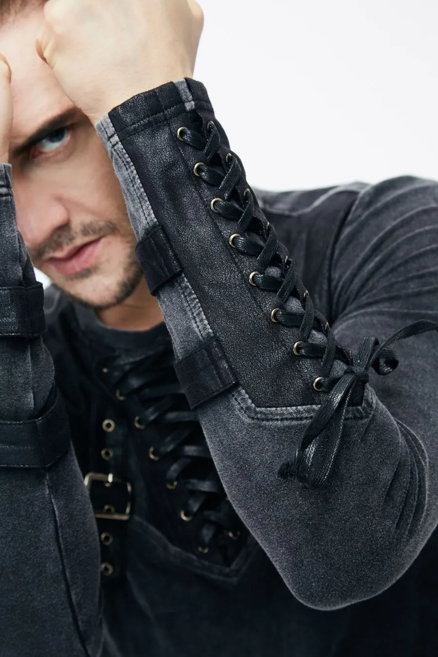 Pull gothique homme col rond en tissu léger gris anthracite, il est agrémenté de piÚces de simili cuir noir et de laçages aux manches et au niveau de la poitrine