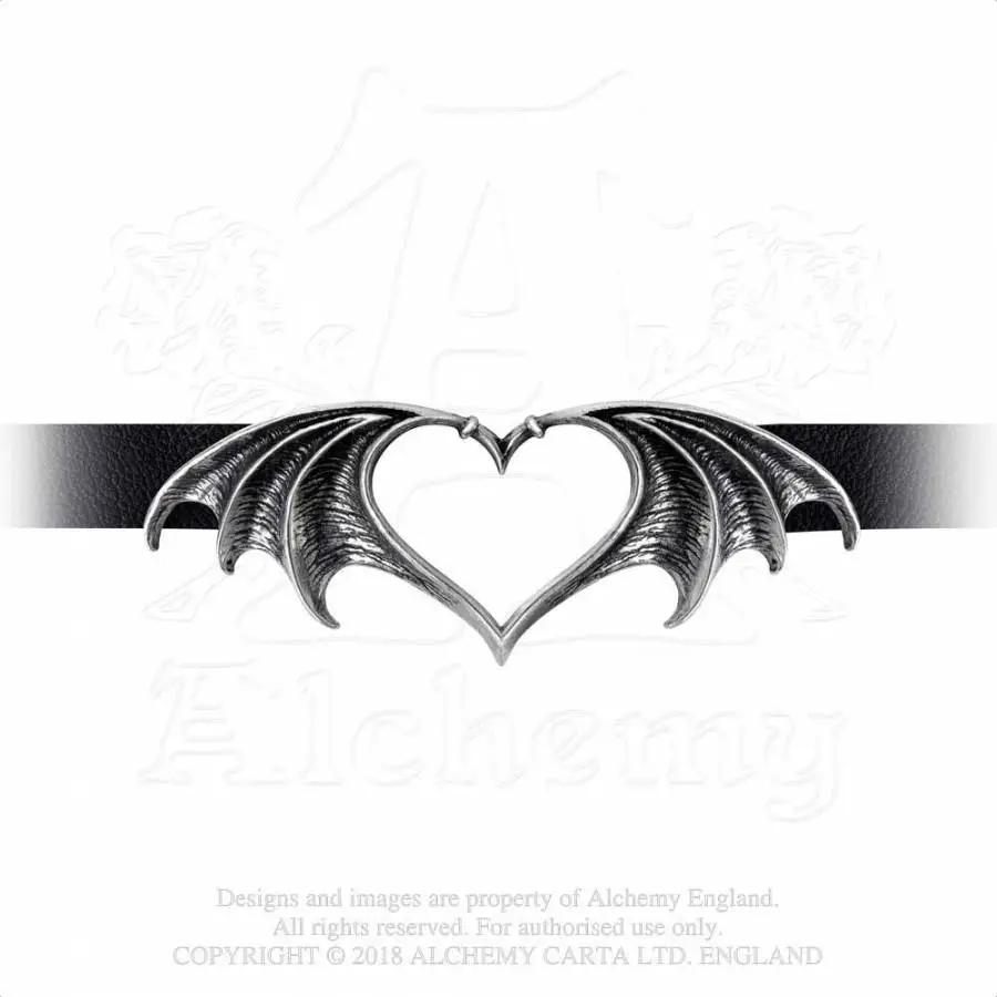 Etroit tour de cou en simili cuir noir ornĂ© d’un superbe coeur aux ailes de chauve-souris en Ă©tain vieilli, plus goth que ça tu meurs !