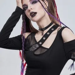 Double bretelles Ă gauche dont l’une est agrĂ©mentĂ©e de gros oeillets et d’une grande main de squelette en mĂ©tal