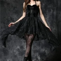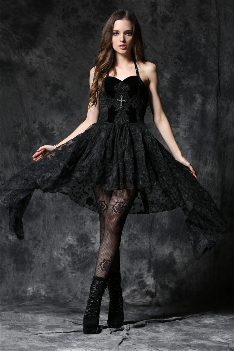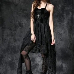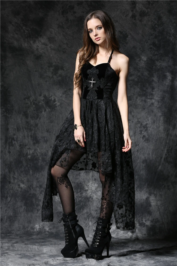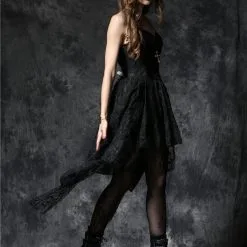 Belle robe/bustier gothique entiÚrement recouverte de tulle trÚs fin à la décoration florale, coupe asymétrique plus longue sur les cÎtés lui donnant un style bien particulier.