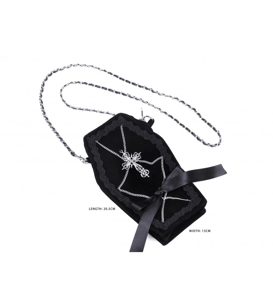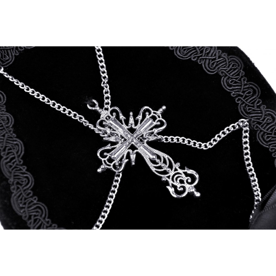 Elle est ornĂ©e d’une croix gothique en mĂ©tal, de petites chaĂźnettes ety d’un noeud de satin