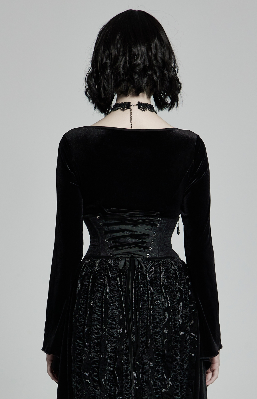 Laçage Ă l’arriĂšre en ruban de velours permettant l’ajustement parfait du serre-taille