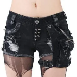 Short gothique femme en jean gris dĂ©lavĂ© avec effets dĂ©chirĂ©s, il est ornĂ© de clous pointus, d’une petite chaĂźne et de piĂšces de tissu filet