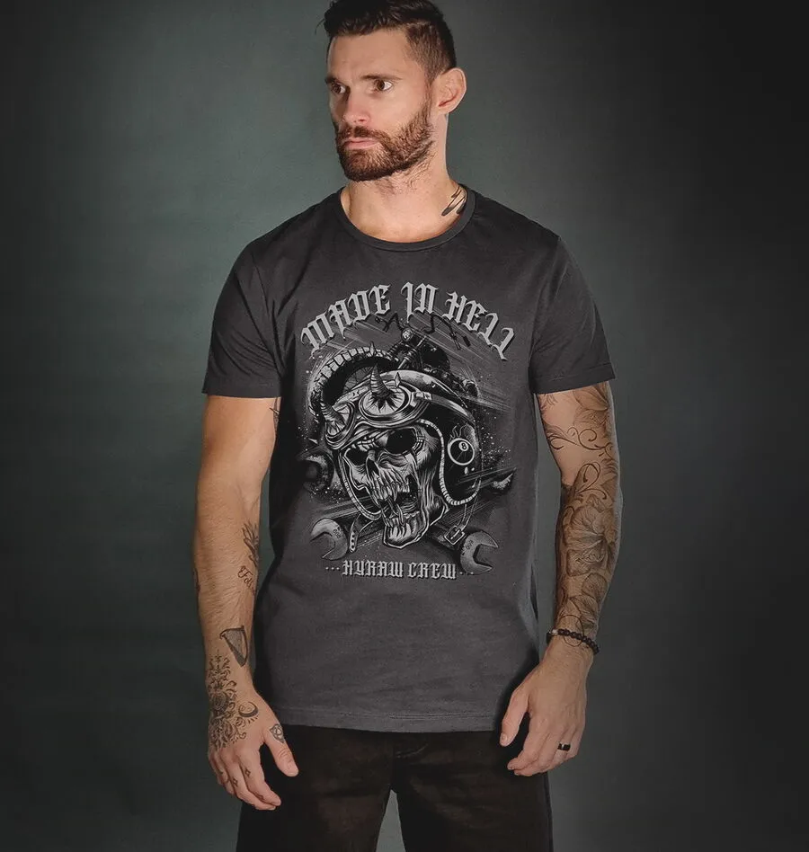 L’imprimĂ© reprĂ©sente un gros skull type biker avec l’inscription “Made in Hell”