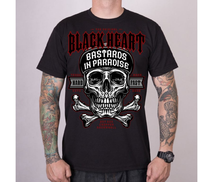 L’imprimĂ© en face avant reprĂ©sente un skull avec une casquette et l’inscription ‘Bastards In Paradise’