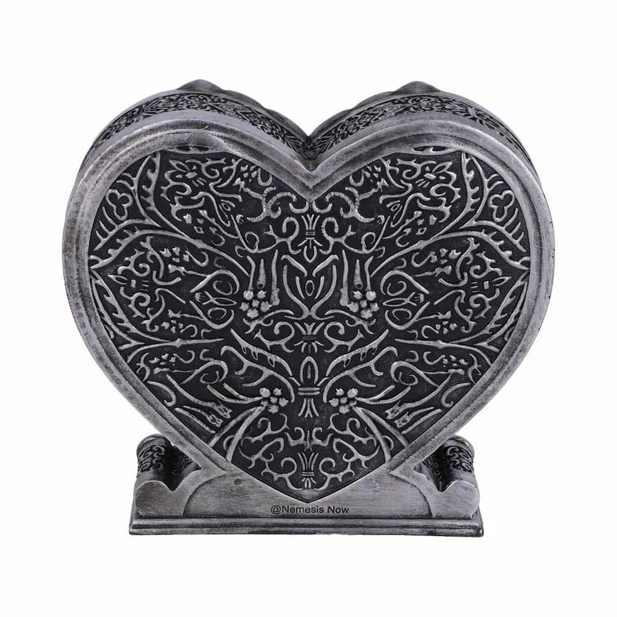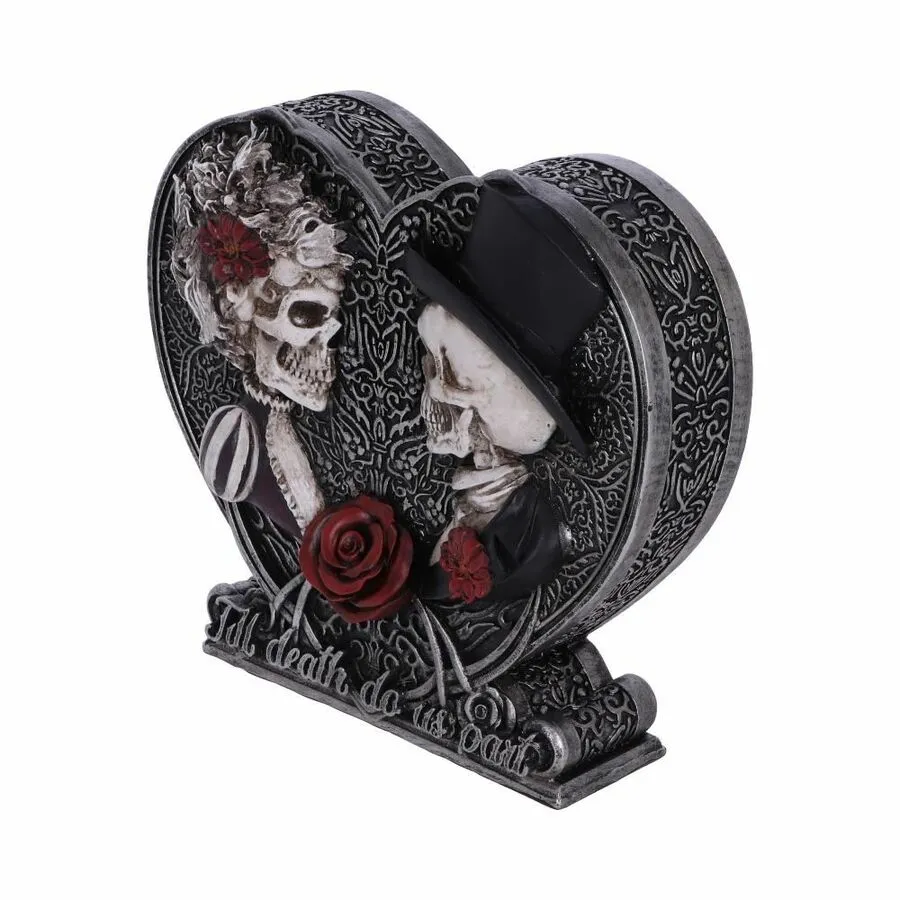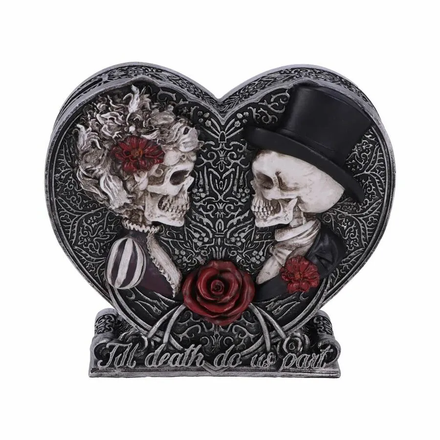 Cette boite est en forme de coeur, est ornée des squelettes de la mariée et du marié entourés de roses rouges et se regardant amoureusement